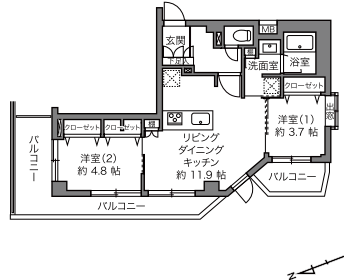 | 専有面積 | 51.43m2 | バルコニー面積 | 14.81m2 |